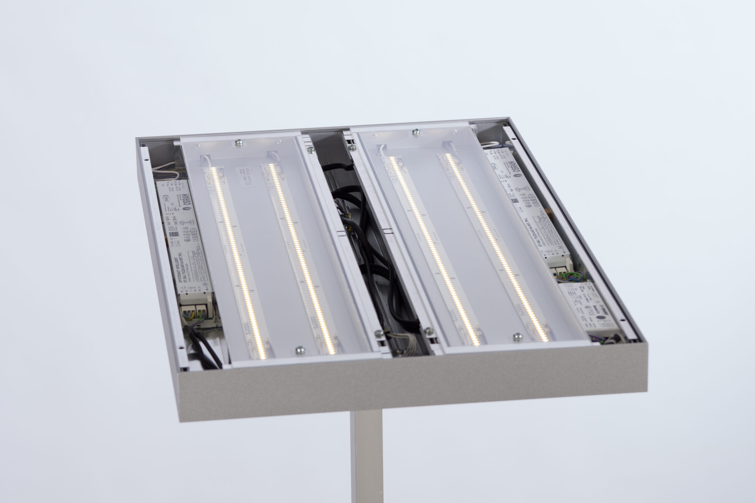 Umbau einer Rasterleuchte. Der Reflektor kann beibehalten werden. Die Lichtsteuerung SmartLink kann einfach integriert werden.