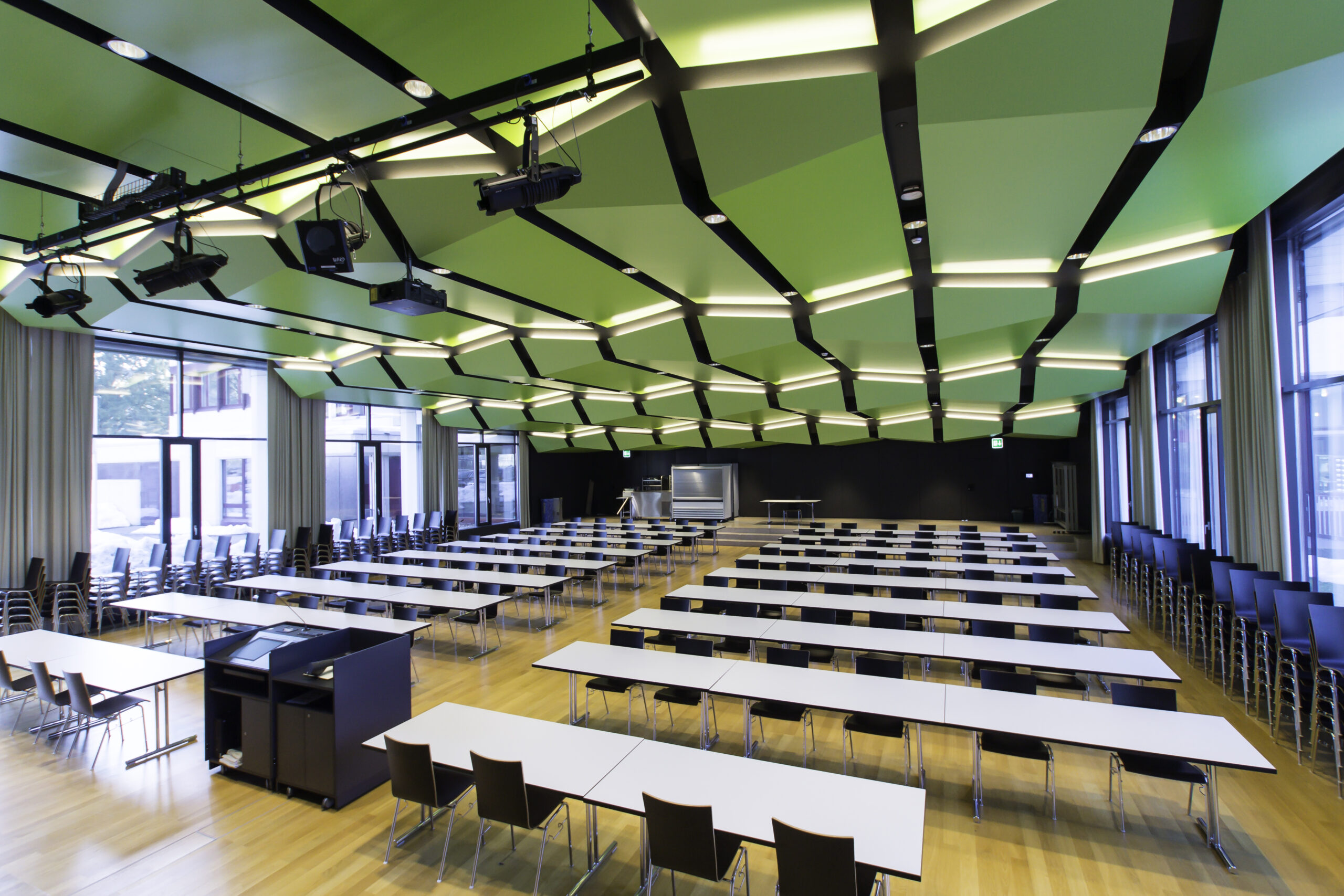 Die Besonderheit bei diesem Projekt bestand darin, dass wir für die bestehenden Downlights mit 250W-Halogenleuchtmittel kundenspezifische COBs in TunableWhite mit einer Lichtstärke von 7000lm entwickelt haben. Mit diesen COBs sowie einem neuen Kühlkonzept konnten die bestehenden Leuchten erhalten werden. Die Dimmung erfolgt flickerfrei und HD-Kameratauglich. Die Lichtfarbe kann zwischen 2700K und 5600K stufenlos je nach Situation eingestellt werden.