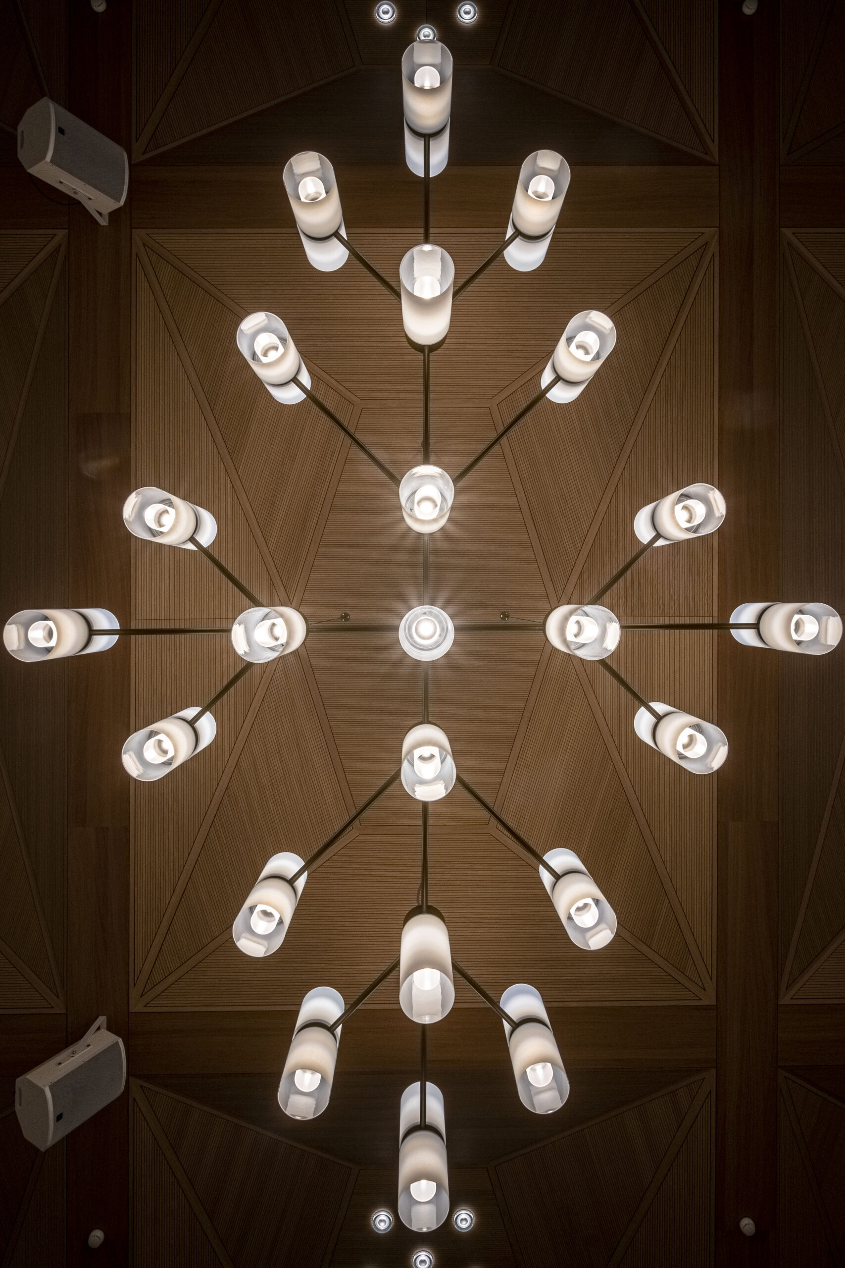 Die drei grossen Kronleuchter im Luftraum der Mensa mit gut 5m Länge und rund 2m Breite verfügen über insgesamt 39 LED-Module in mundgeblasenen Glaszylindern. Die imposanten Leuchtobjekte sind mit je 4 Stahlseilen von der aufwändig gestalteten Holzdecke abgependelt und sorgen für eine dezent festliche Stimmung.